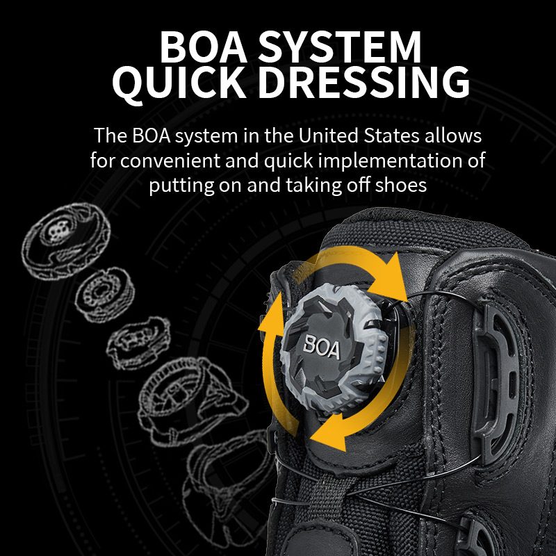 ລະບົບ BOA ເຮັດໃຫ້ການເປີດ / ປິດບໍ່ສະດວກ: ການບິດໄວເພື່ອແຫນ້ນ, ດຶງເພື່ອປົດປ່ອຍ. ບໍ່ມີ laces, ບໍ່ hassle.